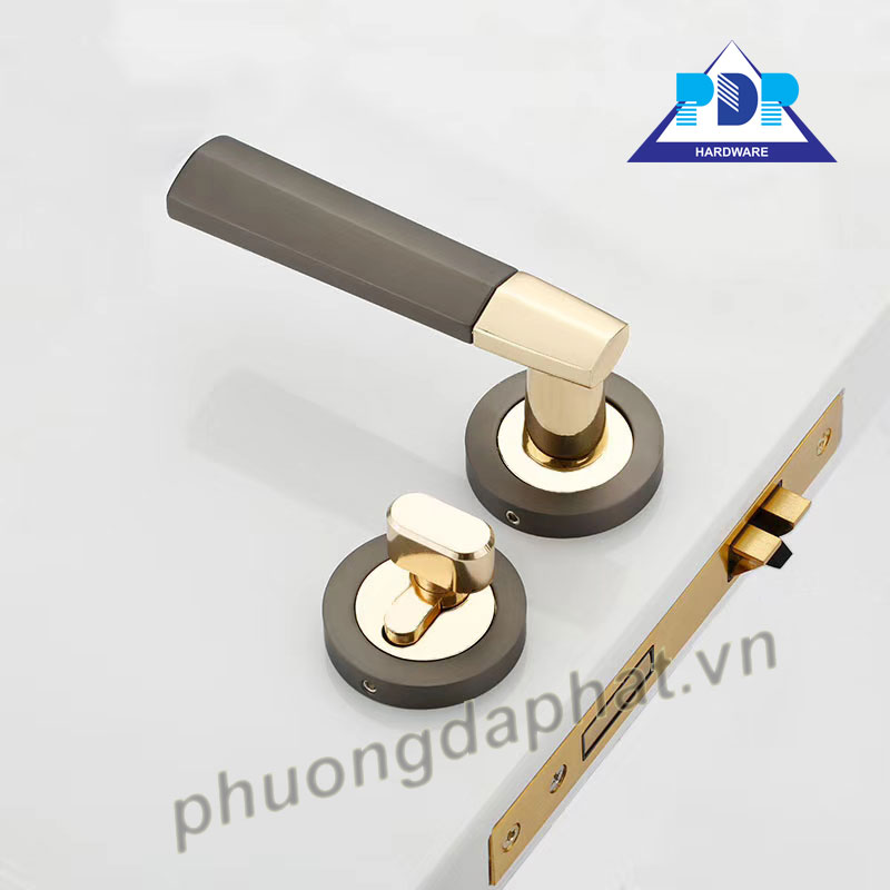 Khóa Cửa Tay Gạt PDP0410 mang dáng vẻ hiện đại với sự kết hợp giữa màu vàng bóng và xám tạo sự thanh lịch cho tổng thể.