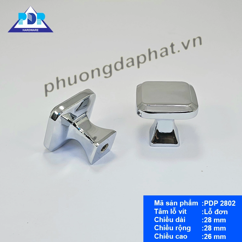 - Núm tay nắm tủ PDP 2802 thiết kế hiện đại, tối giản với chất liệu hợp kim kẽm mạ crom sáng bóng, kích thước 28x28x26mm. Phù hợp cho tủ bếp, tủ quần áo, tủ giày… dễ lắp đặt với lỗ vít đơn, bền đẹp theo thời gian.