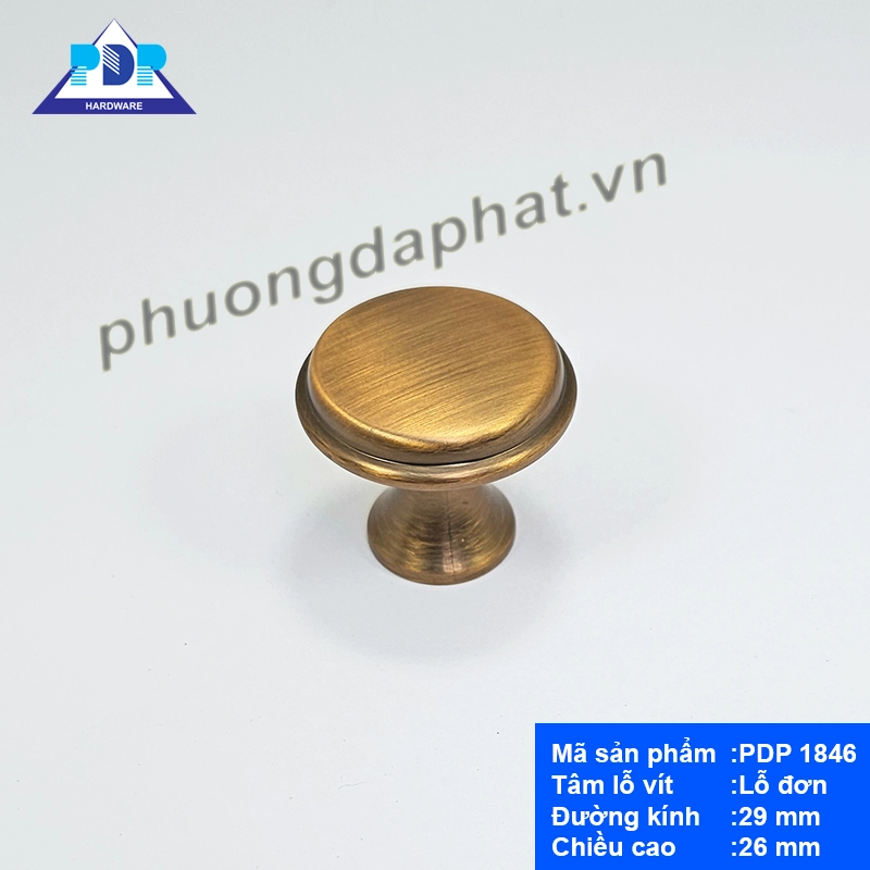 Mẫu núm tay nắm PDP 1846 có đường kính 29mm, chiều cao 26mm – kích thước lý tưởng để gắn lên cánh tủ hoặc hộc kéo. Thiết kế dạng núm tròn, lỗ vít đơn, dễ lắp đặt, phù hợp với nhiều vị trí trong nhà như tủ bếp, tủ giày, tủ đầu giường,…