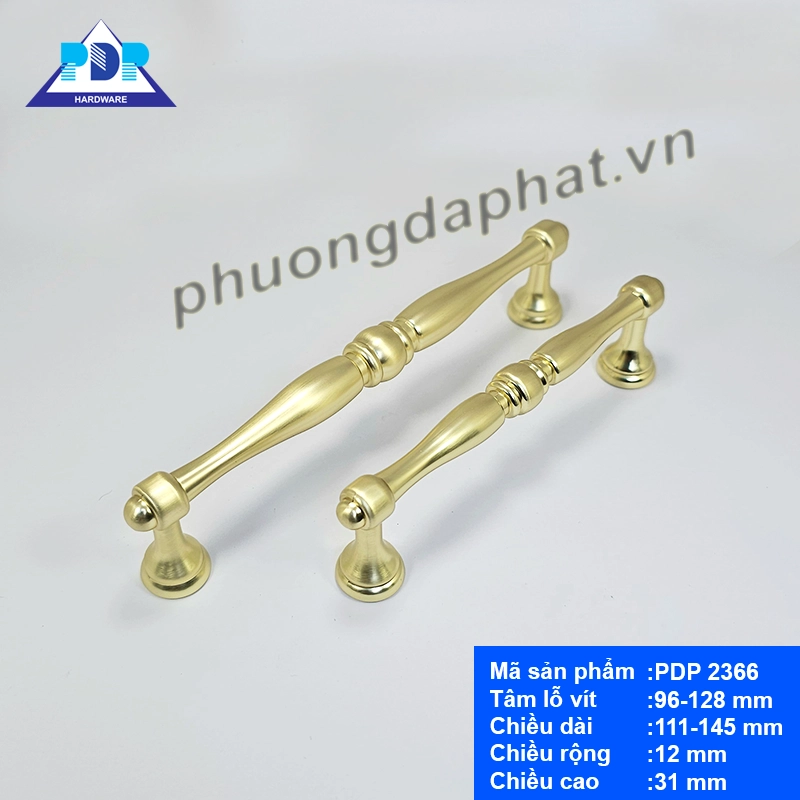 Tay nắm tủ PDP 2366 có tâm lỗ vít từ 96mm-128 mm, chiều dài 111mm-145 mm, giúp người dùng dễ dàng lựa chọn kích thước phù hợp với từng loại tủ. Đặc biệt, kiểu dáng thuôn dài, hai đầu bo tròn tạo cảm giác mềm mại, thuận tiện khi cầm nắm và sử dụng.