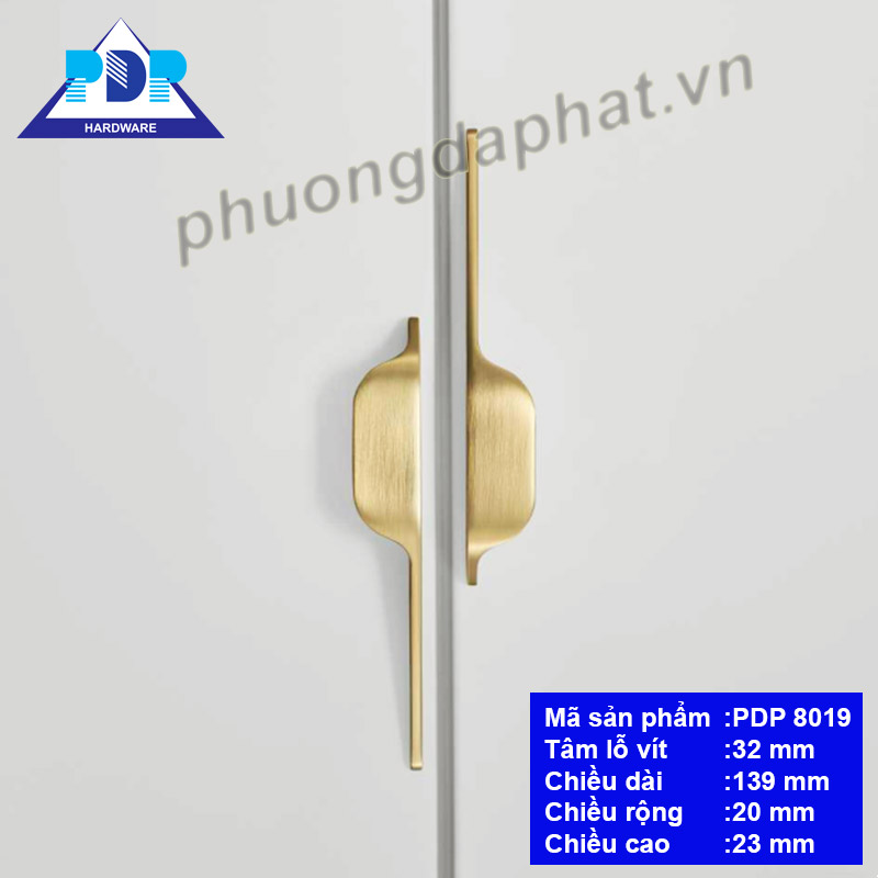 • Tay Nắm Tủ Hiện Đại Màu Vàng Xước PDP8019 với thiết kế đối xứng độc đáo cùng màu vàng xước vô cùng duyên dáng. Ứng dụng rộng rãi thích hợp cho mọi cách lắp đặt dọc hay ngang.