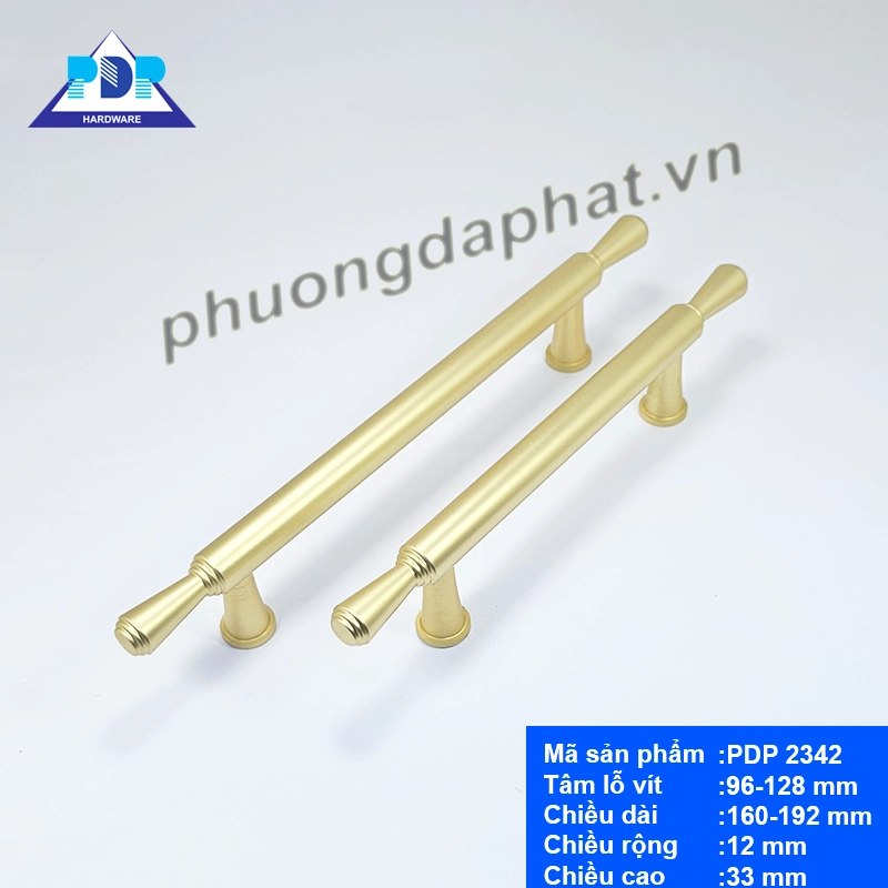 Tay nắm PDP 2342 có tâm lỗ vít từ 96mm đến 128mm, phù hợp với nhiều loại tủ. Kích thước tổng thể dài từ 160mm đến 192mm, rộng 12mm và cao 33mm – vừa vặn để cầm nắm thoải mái, không quá to cũng không quá nhỏ. Sản phẩm có thể sử dụng cho tủ bếp, tủ quần áo, tủ giày hoặc các loại tủ trang trí, giúp không gian sống trở nên đồng bộ và hiện đại hơn.
